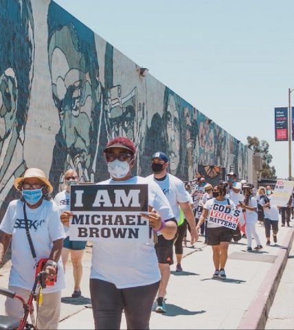 Participants wore custom shirts with “seek justice” printed on the front, based on Isaiah 1:17, and “Adventists for Black Lives Matter” on the back. The shirts represented another miracle; they were meant for a prayer walk two days later, but production was accelerated just in time for the Los Angeles demonstration. Many carried signs: “God’s voice matters.”